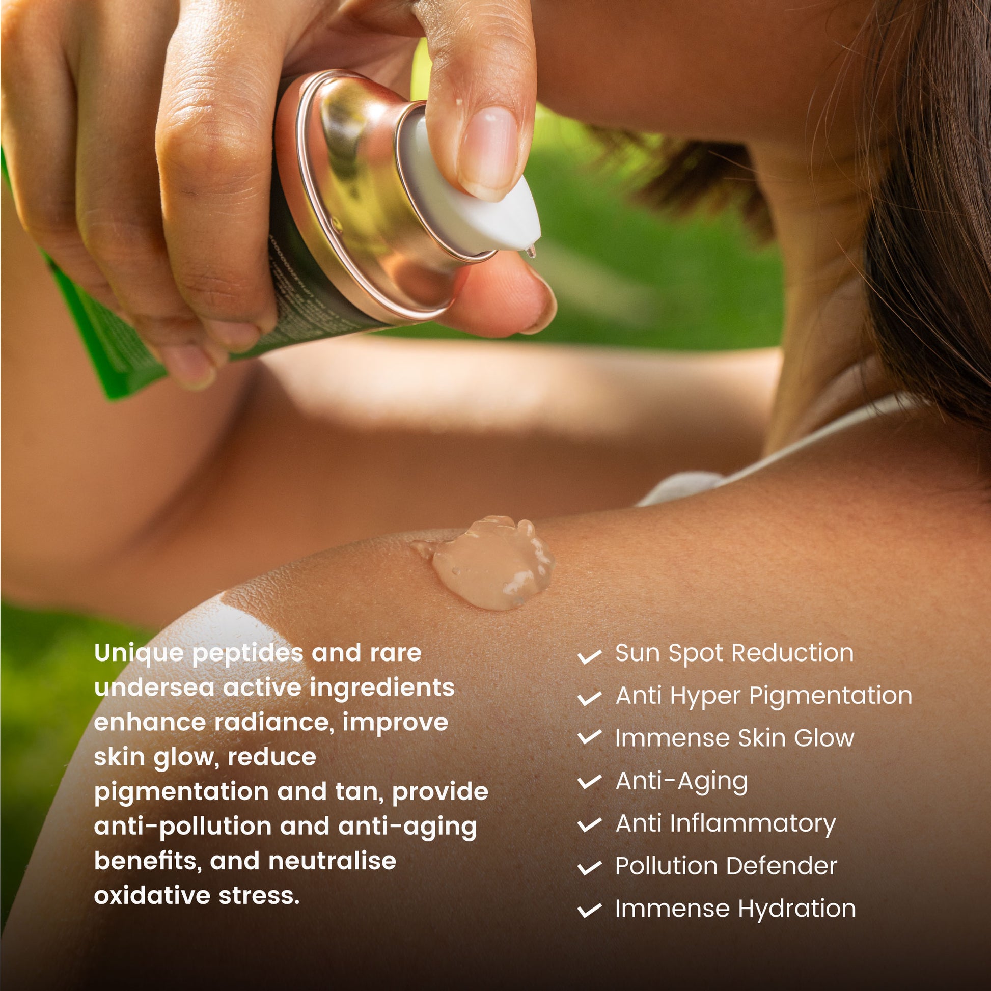 Unique peptides and rare undersea active ingredients enhance radiance, improve skin glow, reduce pigmentation and tan, provide anti-pollution and anti-aging benefits, and neutralise oxidative stress.